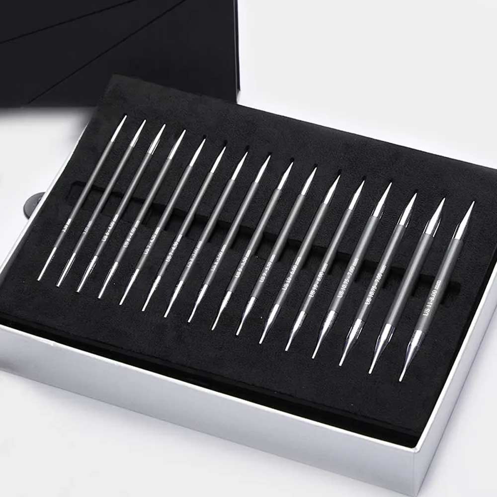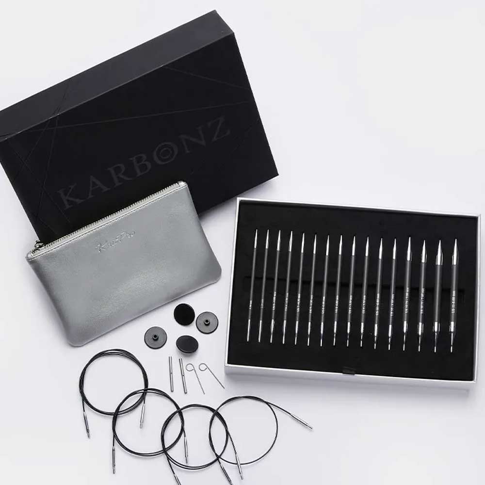 Das KnitPro Karbonz Deluxe austauschbare Rundstricknadel Set "Box of Joy" bietet dir die perfekte Kombination aus Leichtigkeit, Stabilität und Eleganz. Die acht Nadelspitzenpaare in den Größen 3,50 mm bis 8,00 mm bestehen aus leichter und superstarker Karbonfaser, die für ein müheloses Stricken sorgt. Die glatten Messingspitzen gleiten sanft durch jedes Garn und bieten Präzision bei jeder Strickarbeit. Dank der gut lesbaren Lasergravur bleiben die Nadelstärken auch nach langem Gebrauch klar erkennbar.