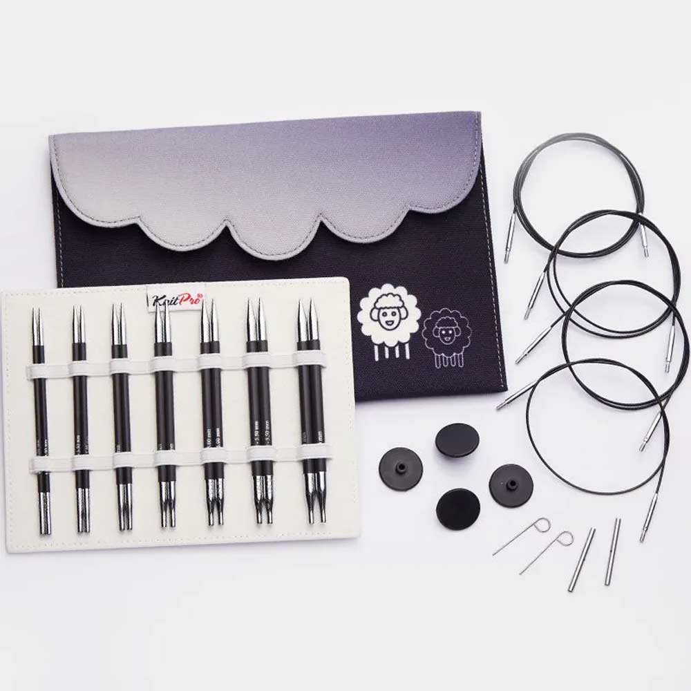 Mit diesem Set kannst du die Nadelspitzen ganz einfach auf die gewünschten Seile aufschrauben und sicher befestigen. Es ist somit bestens geeignet für eine Vielzahl von Stricktechniken und Garnen. Das Set wird in einem stilvollen, dunkelgrauen Stoffetui mit einer charmanten Schäfchenillustration geliefert, das nicht nur für Ordnung sorgt, sondern auch optisch ansprechend ist.