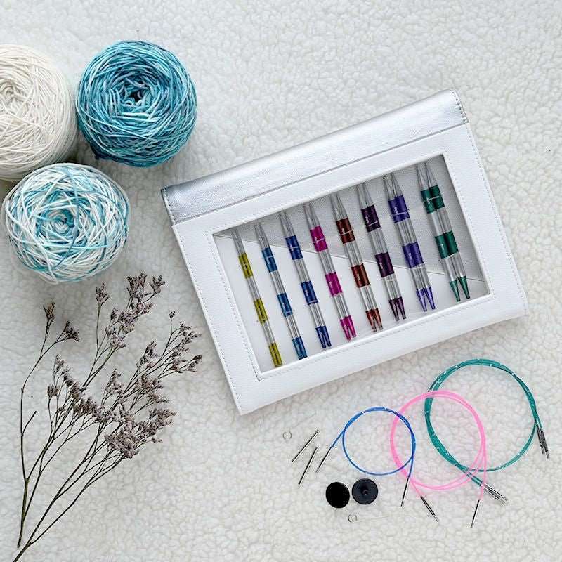 Zusätzlich zu den Nadelspitzen enthält das Set vier flexible Kabel in den Längen 60 cm, 2 x 80 cm und 100 cm, die dir maximale Flexibilität bei deinen Projekten bieten. Die Nadeln und das Zubehör werden in einem eleganten Etui aus veganem Leder in Weiß und Silber aufbewahrt, das nicht nur praktisch, sondern auch stilvoll ist.